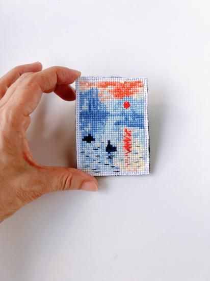モネの印象・日の出のクロスステッチがブローチとして作れるキットです。